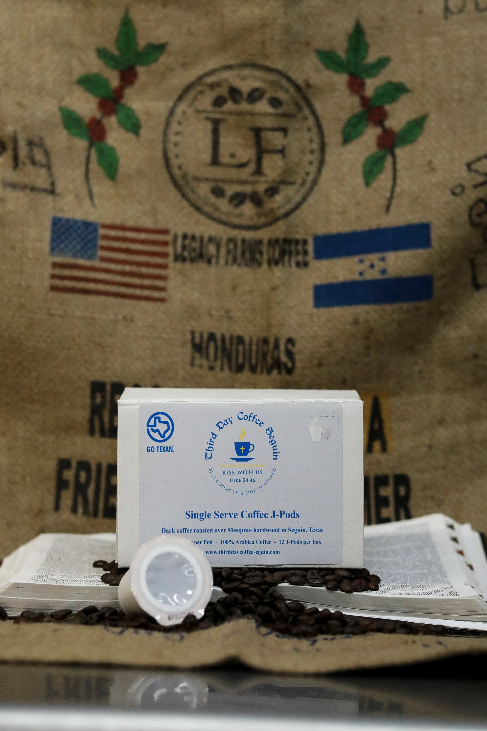This is the Seguin dark roast coffee you have to come to love but this is our new single-serve Pods that we call J-Pods! Mostly so we don't get sued! each box has 12 J-Pods with 14 grams of coffee each.